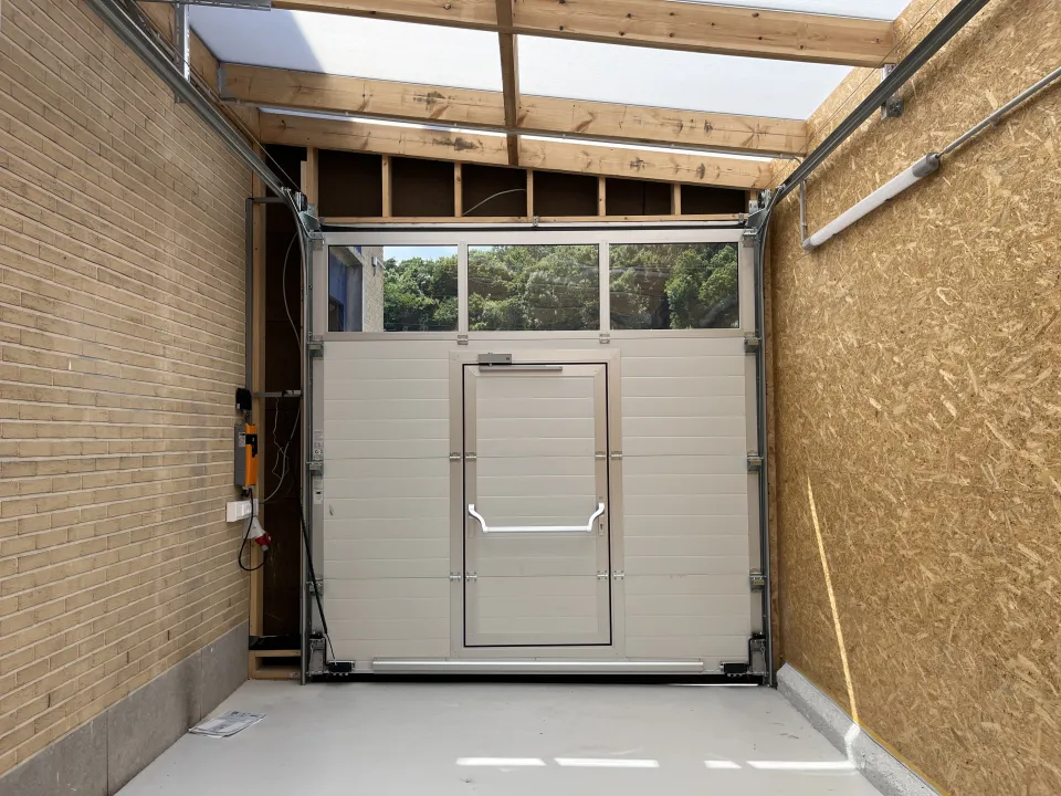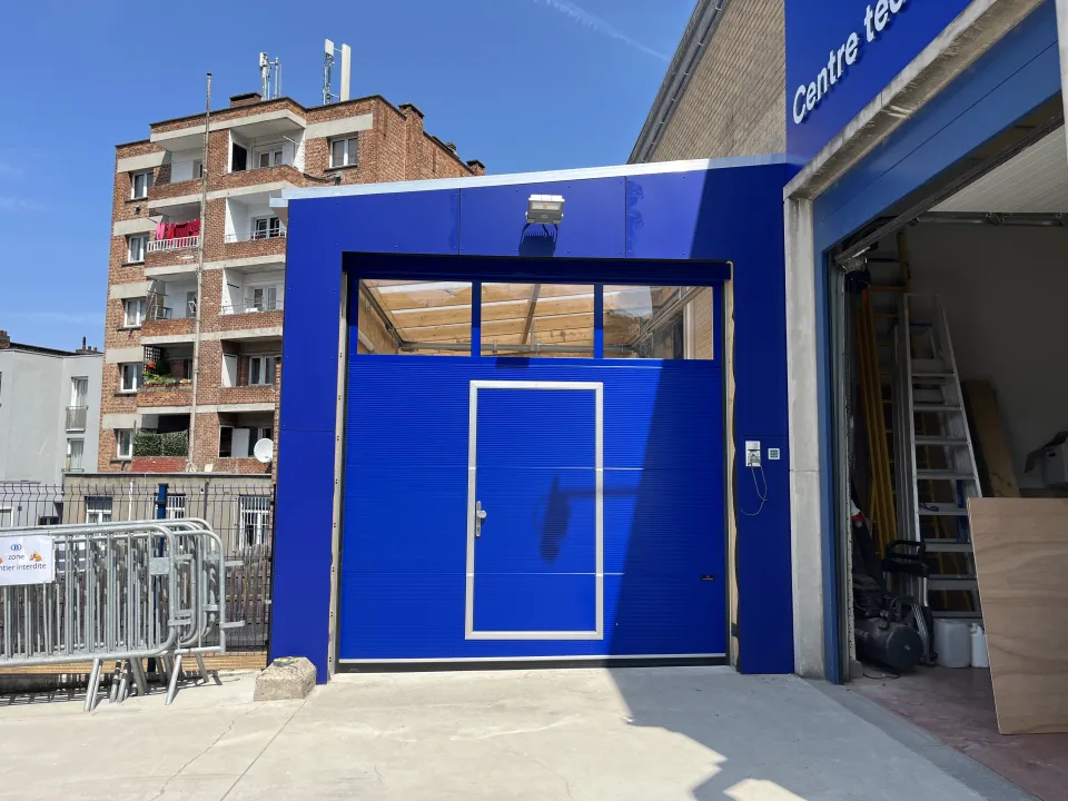 Installation d’une porte sectionnelle industrielle Alpha Deuren ISO40 avec portillon à Liège
